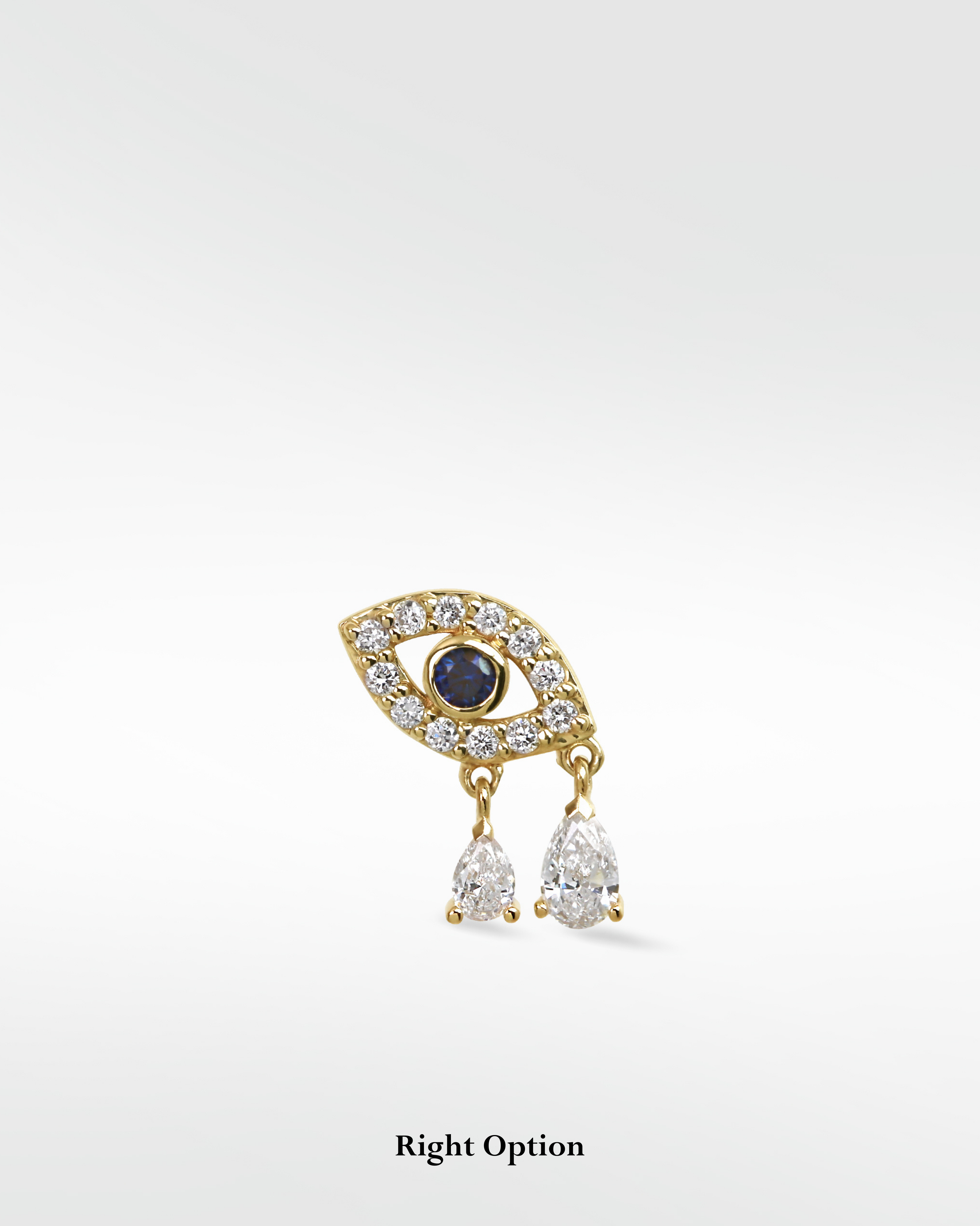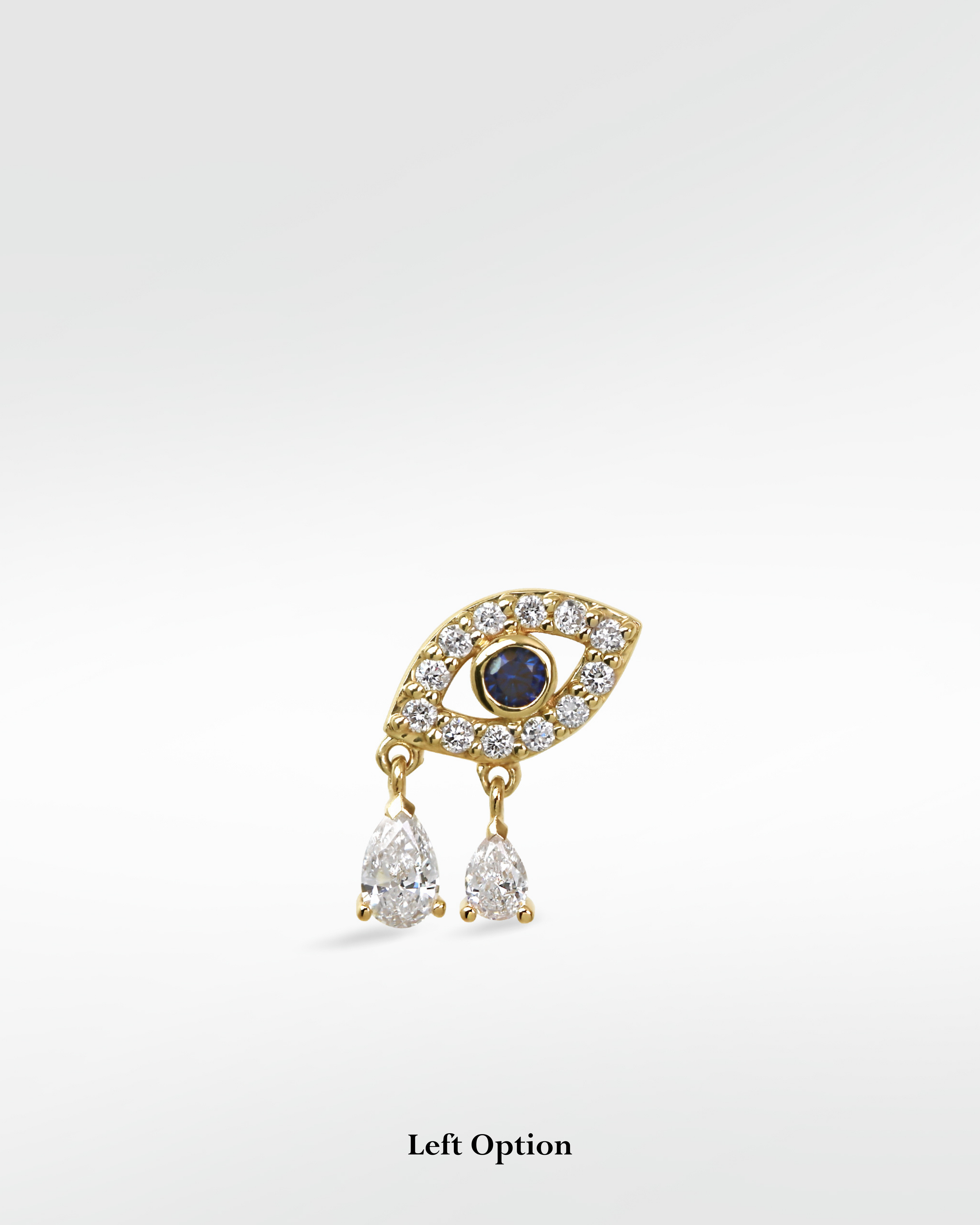 Crafted in 14k gold and set with a vivid blue sapphire at the center, this delicate stud is a modern take on the classic protective symbol. The teardrop accents add movement and elegance, making them perfect for expressing your vision and creativity while keeping your energy safeguarded. The two diamond drops give a wonderful movement to the piece- great for any location on the ear. Two tear drops for everywhere you're rising at once.