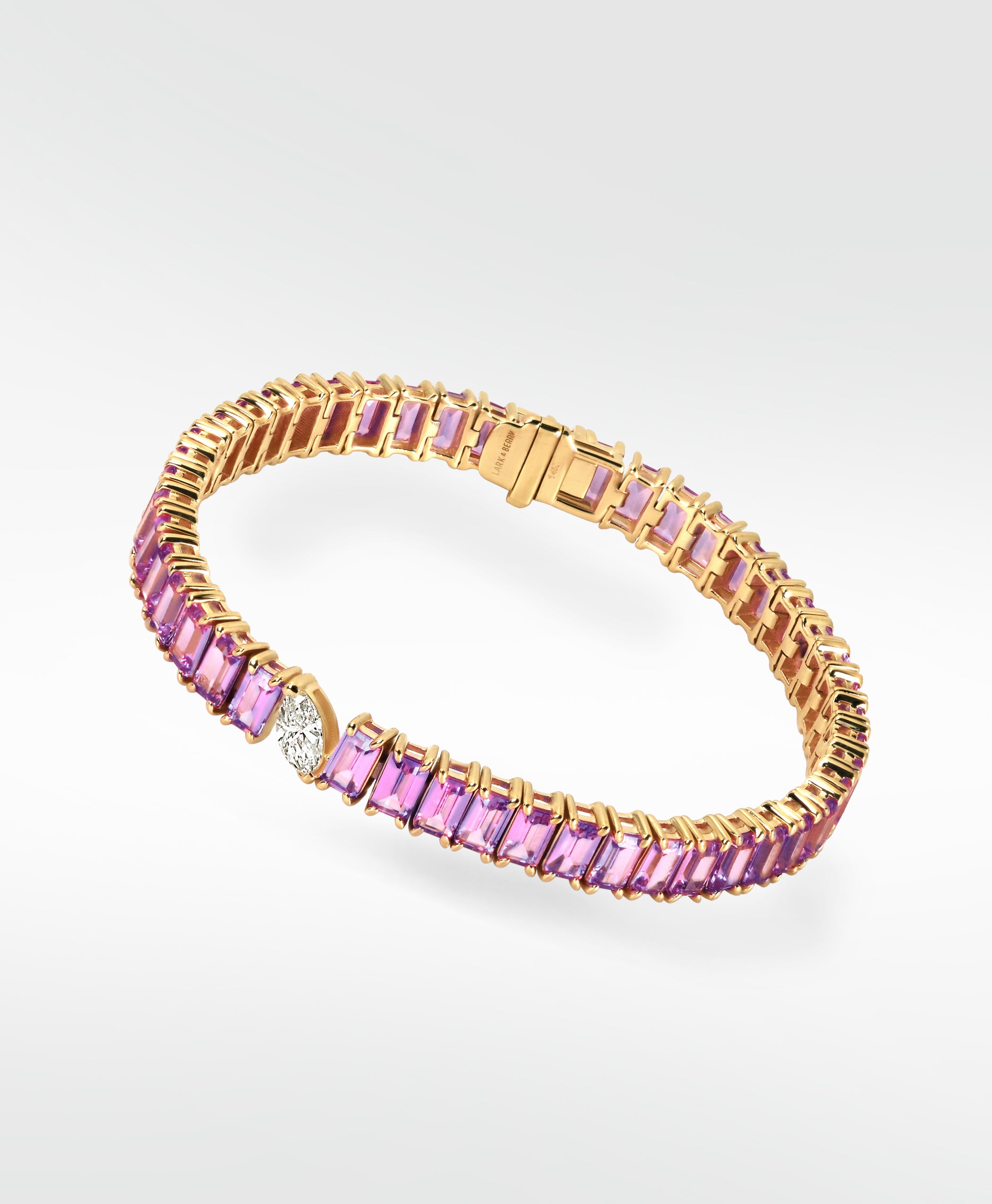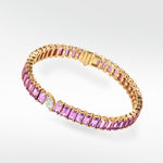 This exquisite tennis bracelet is designed to captivate a portrait set pink sapphires in fancy emerald cut. Enhancing its modern allure, a striking offset marquise-cut lab-grown diamond disrupts tradition, transforming it into a truly unique piece.