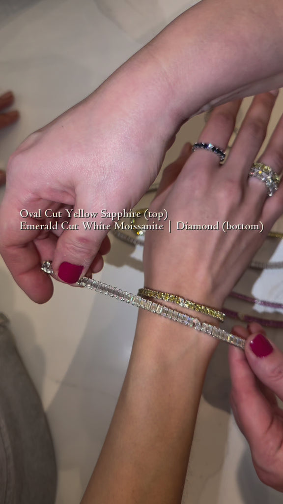 This exquisite tennis bracelet is designed to captivate a portrait set yellow sapphires in fancy oval cut. Enhancing its modern allure, a striking offset marquise-cut lab-grown diamond disrupts tradition, transforming it into a truly unique piece.